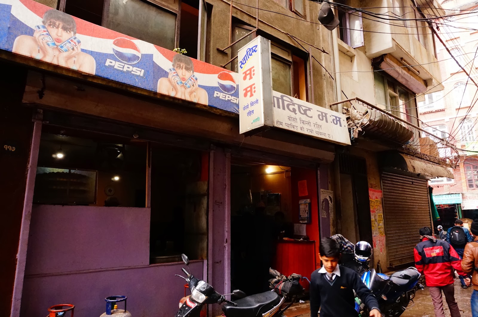 細い路地にあるうえに看板はみての通りネパール語。通り過ぎそう。(というかこの道とおらんかも)